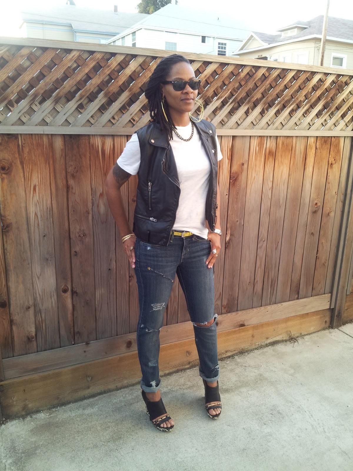 I love white tees. When I buy them I usually have to buy a couple at a time because it doesn't look as fresh after a few washes. The last white t-shirt I've bought was actually from a goodwill store and I wore it for this week's challenge. You can do anything with a white t-shirt. It's very plain and basic but also versatile and can be dressed up or down. I decided to dress mine up a little and by dress up I mean wear heels or wedges or anything higher than 1 inch. I paired it with a moto vest and my DIY destructed jeans, which I've also worn here. My accessories were a couple of gold bracelets, DIY chain link necklace, large gold hoop earrings, bangle watch, sunnies, and a neon belt for a little pop of color.