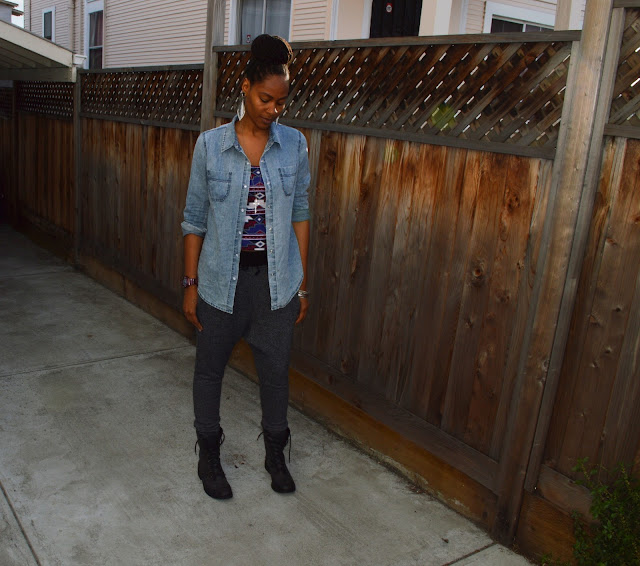 In keeping up with the sporty look this week I decided to style a pair of men's drop crotch pants that I've bought not too long ago from Jack Threads. Mel has a matching pair too and she's worn hers already. I promise we won't dress like twins and wear it on the same day. Well maybe. ;-) At first we weren't quite sure whether or not to keep them because it is pretty different but different can be cool so we decided to keep them. They are really soft and comfortable and it looks like a pair of pajama pants in my opinion. I paired mine with some black combat boots and wore layers on top with a mineral wash denim shirt and an tribal print tank. The pants would also look good worn with a crop top and a beanie.
